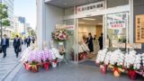 オフィスビル玄関に胡蝶蘭が並ぶ開業当日のシーン
