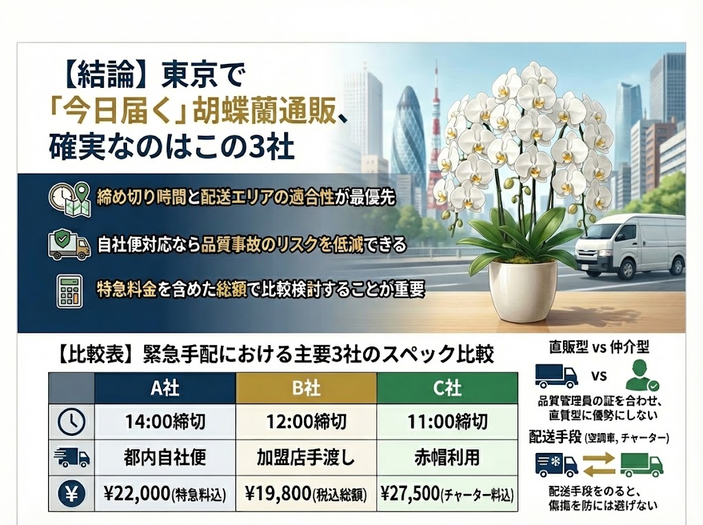 【結論】東京で「今日届く」胡蝶蘭通販、確実なのはこの3社