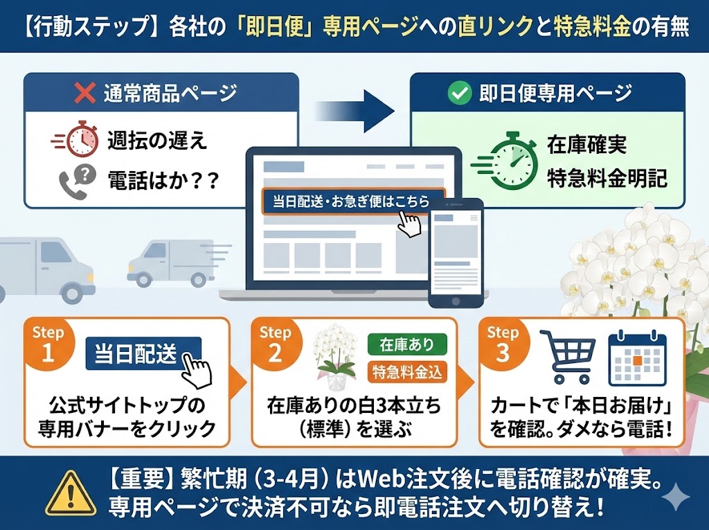 通常の商品ページから注文すると、備考欄での確認や折り返しの電話待ちが発生し、その間に配送締め切り時間を過ぎてしまうケースが多発しています。即日対応専用のページでは、在庫のある商品のみが表示され、特急料金(通常+2,000円?5,000円程度)が最初から加算されているか、オプションとして明確に提示されています。これにより、注文後の「追加料金の確認」という不毛なやり取りを省略できます。