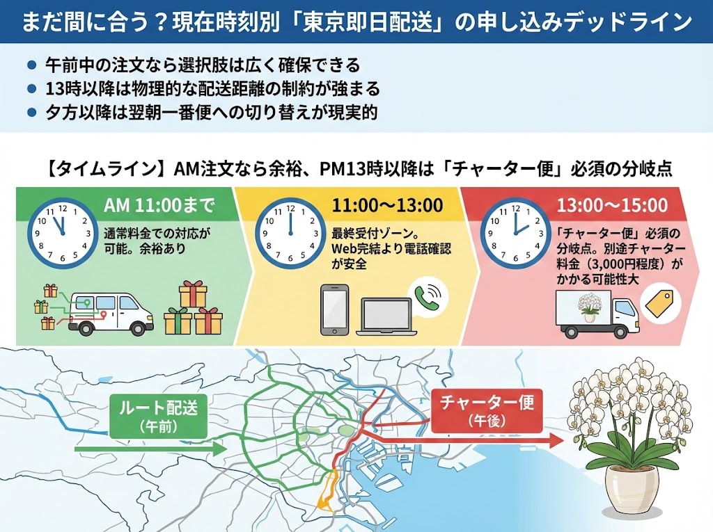 東京で即日配送を成功させる鍵は、「注文締め切り時間」と「配送手段」の2点を正しく把握することです。