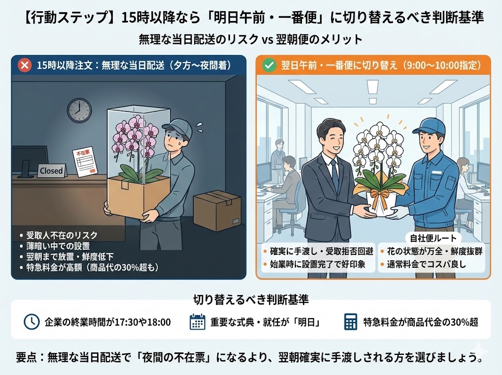 翌日午前便に切り替えるべき判断基準は以下の通りです。