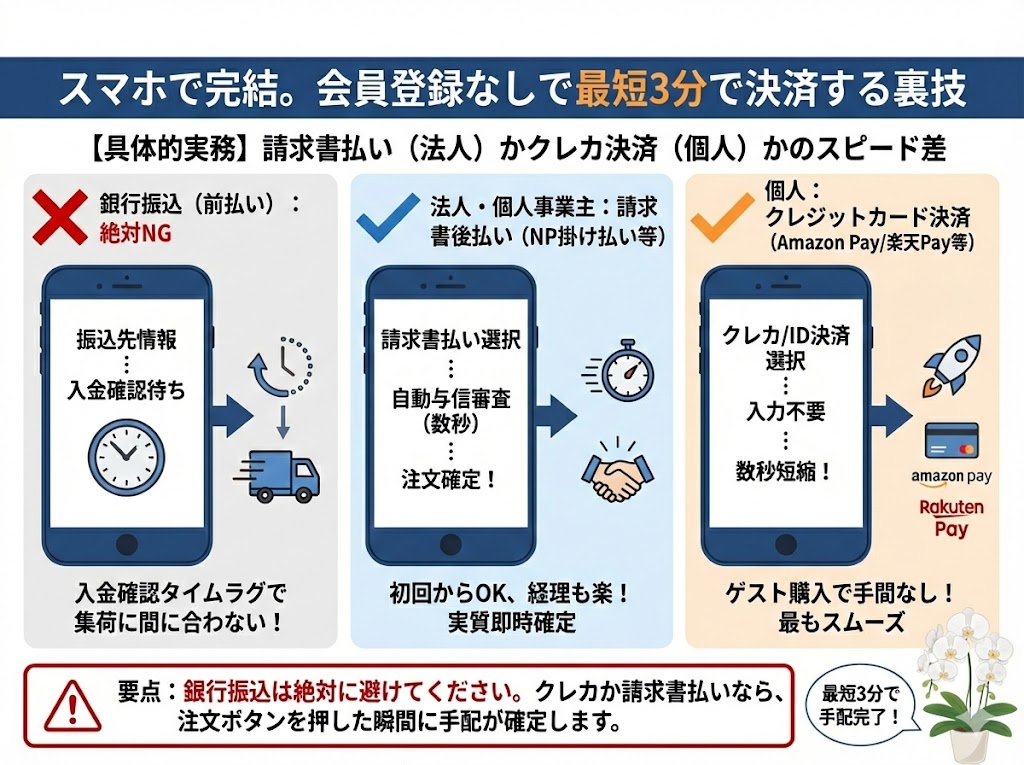 決済方法の選択ミスは、発送手続きの遅れに直結します。即日配送では「入金確認不要」の方法を選ぶのが鉄則です。