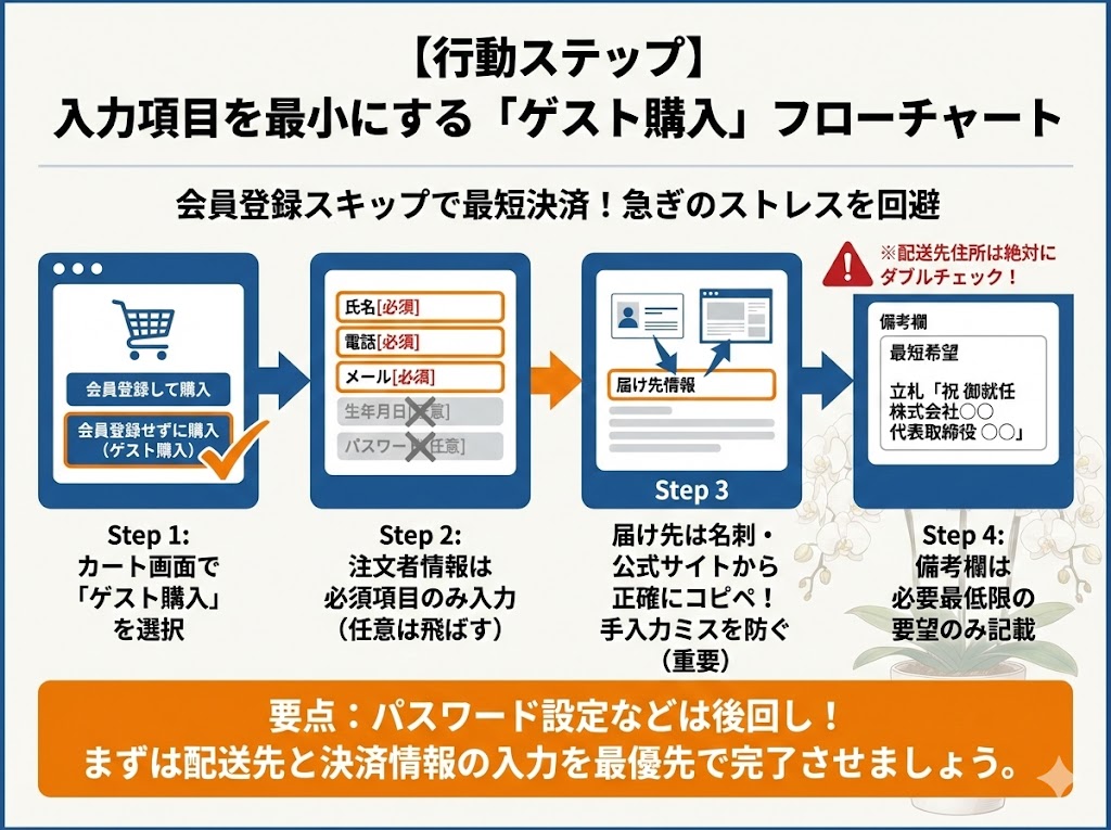 - Step 4: 備考欄には必要最低限の要望(例:「最短希望」「立札は『祝 御就任 株式会社〇〇 代表取締役 〇〇』」)のみ記載する。