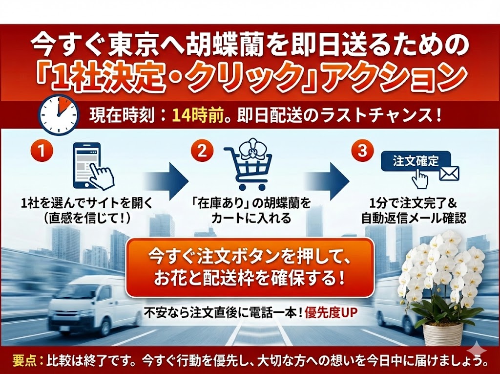 今すぐ東京へ胡蝶蘭を即日送るための「1社決定・クリック」アクション